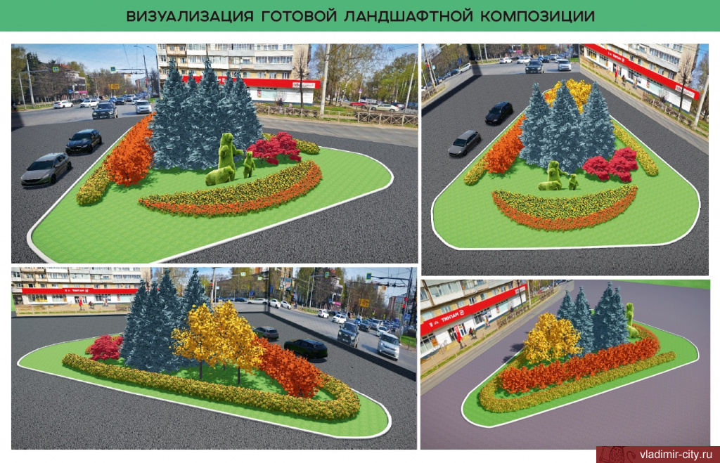 - На перекрёстке улицы Горького и проспекта Строителей, рядом с существующей топиарной композицией «три медведя», высадят дополнительные деревья и декоративные кустарники, включая вид с листьями, меняющими окраску в зависимости от сезона.